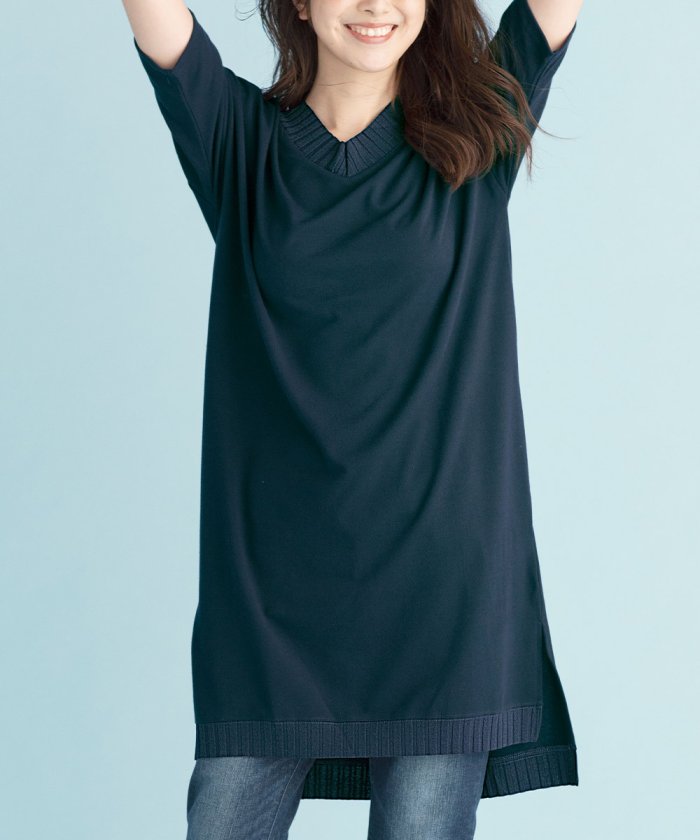 カジュアル顔もエレガント顔も得意。さらっと着こなしておしゃれ見え衿ぐりと裾をリブで切り替えたシンプルなロング丈チュニック。サイドスリットや顔まわりをすっきり見せるVネックがポイントです。