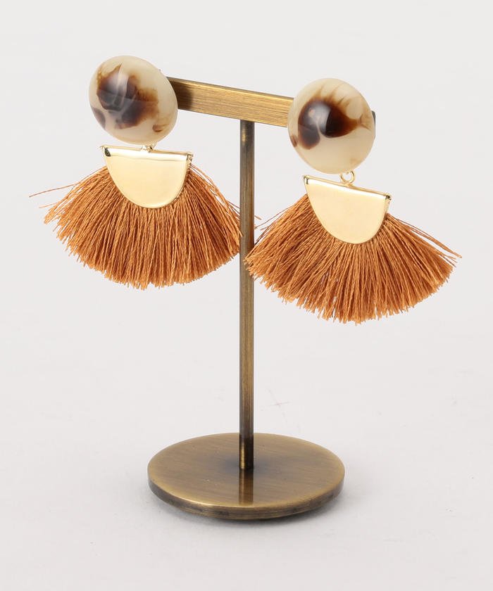 人気のフリンジデザインが魅力のスタッドピアス/イヤリング。べっ甲調のラウンドモチーフにメタルパーツ、短めのフリンジを組み合わせて仕上げています。ほどよい主張で様々なヘアスタイルやコーディネートと相性がよく、さりげなくアクセントになってくれるアイテム。軽やかな春夏スタイルに最適なアクセサリーです。