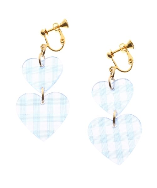 大きさに変化を付けたギンガムチェック柄のハートモチーフをWであしらったイヤリング。透け感のあるクリア素材仕立てで見た目にも涼しげなアイテム☆