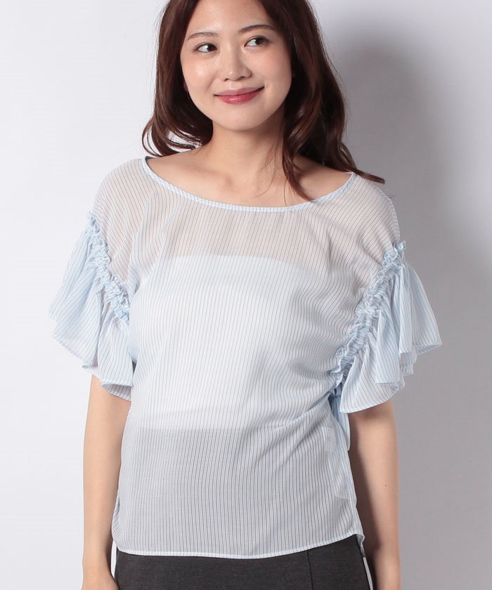 袖にたっぷりと施されたフリルが、女性らしい甘さを演出するブラウス。広めに開いた首元がデコルテをきれいに見せてくれます。タイトなスカートやパンツと合わせたフェミニンコーデがオススメ。