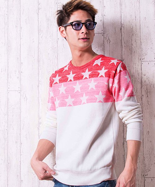 CavariA【キャバリア】国産グラデーションスター柄クルーネック長袖ニットソー