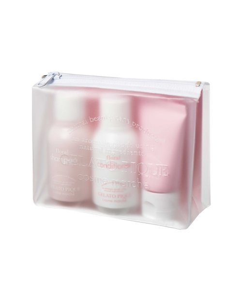 シャンプー・コンディショナー:直径3.8cm、高さ8.7cmトリートメント:直径2.8cm、高さ8.9cmポーチ:たて9.7cm、よこ12.8cm、マチ4cm