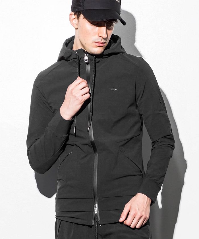 ディテールの注目ポイントは、レイヤード風にデザインされた裾部と、マット素材の止水テープ&ブランドオリジナルの引き手を使用した逆開ファスナー、またワンポイントで配された折り鶴のブランドアイコンが目を引く仕上がりです◎