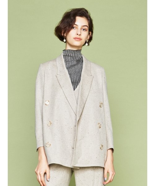 クラシカルなデザインでスタイルを上品に演出するテーラードジャケット。スッキリとしたピークドラペルや、ボタンをやや外側に配したダブルの前打ち合わせなど、個性あるディテールが目を引きます。スリット入りの袖口は、パタンと折り上げて軽やかにアレンジしても。