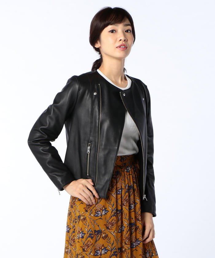 柔らかで断熱性の高いラムレザーを使用しているので、普通のレザーとは段違いな着心地のシングルライダースジャケット。トレンドレスなデザインで愛用の一枚になること間違い無し。ノーカラーのすっきりとしたデザインとコンパクトなシルエットで、ハードになりがちなブルゾンを女性らしく着こなせます。