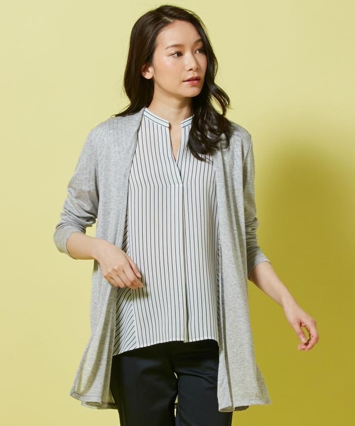 接触冷感で夏場も涼しく!ひらりと優雅な前立てのシルエットが、女性らしい表情を見せる””洗える&シワになりにくい””ロングカーディガン。タイムレスなデザインで毎年大好評の夏の本命カーデが今年も登場!■素材■繊維が細くとろみのあるタッチと、シルクのような上品でツヤのあるマイクロモダールに、キュプラを混紡した糸を用い、独特の表面のふくらみとサラッとした肌触りを実現しました。また、ブライトタイプのナイロン糸を一部混ぜることで、光沢感とシャリ感のある上品な見え感に仕上がっています。軽く、落ち感のある素材感なので、夏場の冷房対策にもおすすめです。薄手なので、毎日の通勤や旅先にと、さまざまなシーンへの持ち運びも便利です。ご家庭で手洗いできるのも嬉しいポイント。■デザイン■程よい透け感で一枚あると何かと便利なカーディガンです。左右にスリットが入っており、長めのレングス設定でも動きやすいデザイン。ライトアウター感覚で使え、パンツスタイルとの相性が特に抜群です。光沢感のある、上品なデザインなので、通勤スタイル合わせから、カジュアルスタイルまで、シーンを選ばずオンオフ活躍する万能の羽織りです。カラーは夏らしいホワイト(#001)、肌なじみのよいベージュ(#033)、大本命のライトグレー(#003)、抜け感のあるネイビー(#075)、シックなブラック(#005)の選べる5色展開です。カラーで印象が異なるので、お色味違いでもおすすめです。■同シリーズ■ショートタイプ(品番:KKWOYA0051)※ 画像はサンプルを使用している為、実際にお届けする商品と仕様やサイズが異なる場合がございます。