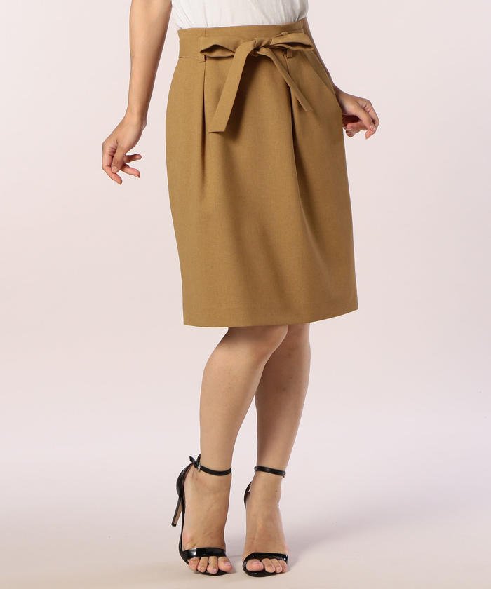 ハイウエスト気味のデザインは、トップスをタックインしてすっきりとまとめるのがおすすめです。共布のリボンベルトが付属して、ウエストマークのアレンジも楽しめます。