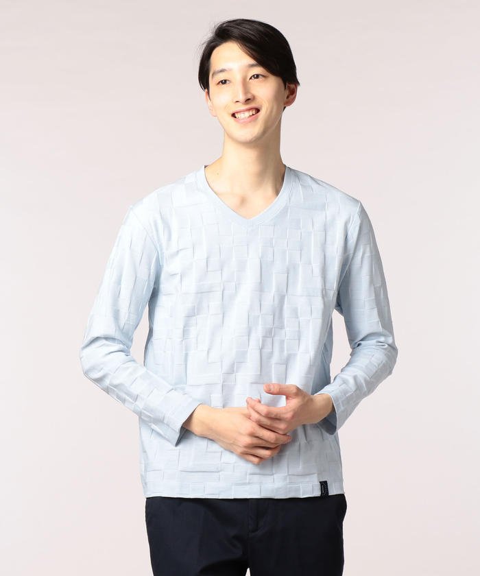 シルケットタイプのハイゲージ糸を使用したリンクス幾何学柄VネックロンT。