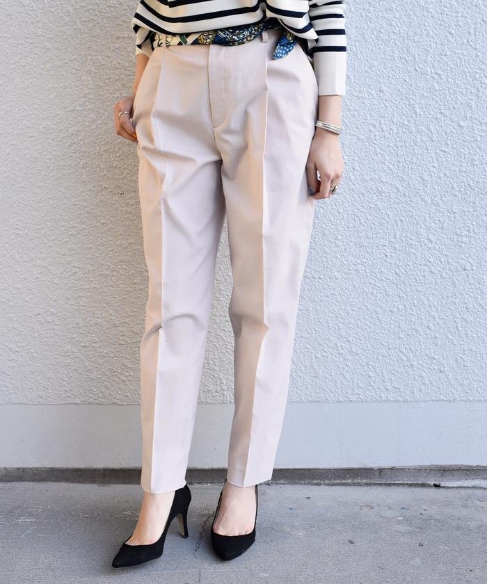 裾にかけて細い程よいスッキリとしたシルエットのテーパードパンツ。