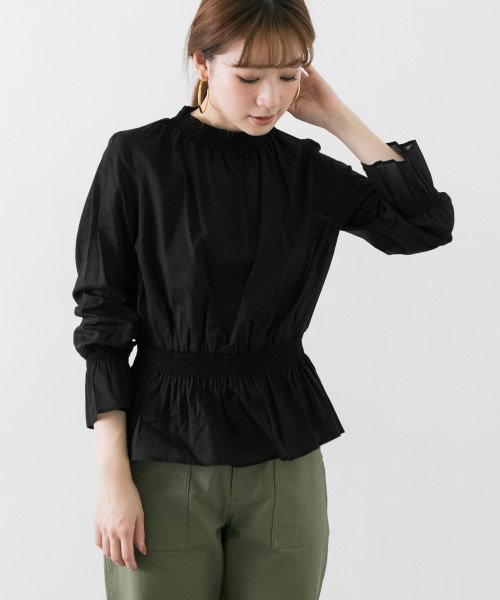 程良いハリ感のあるコットン素材が着心地の良いブラウス。衿元、お袖、ウエストなど、様々なところに施されたシャーリングデザインが、自然とブラウジングしたようにシルエットにメリハリをつけ、1枚でこなれ感がアップします。