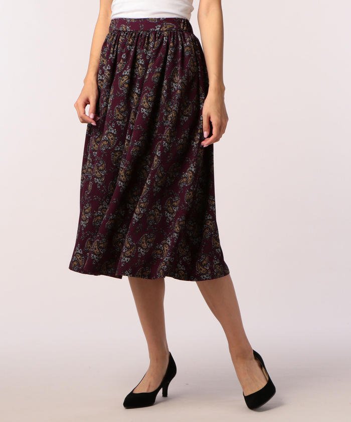 秋冬らしいシックなペイズリー柄のミディ丈スカート。ひらりと舞う裾の揺れ感がコーディネートの女性らしさを引き立てます。ゴム仕様のバックウエストで着脱しやすく、着心地も良好です。ニットやブラウス、ジャケットなど、合わせるトップスによって様々なイメージの着こなしが完成。日常から通勤、パーティまで幅広く重宝します。