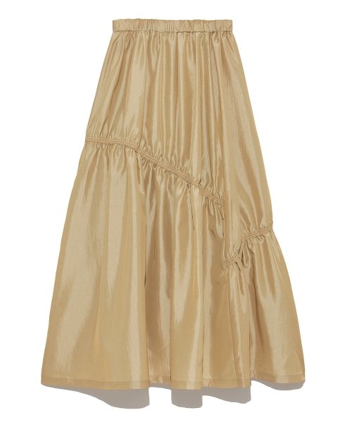 ボリュームたっぷりのタフタスカート。ややシワ加工と光沢感が今年らしい素材。切り替えにはコードの入ったギャザーが新鮮。