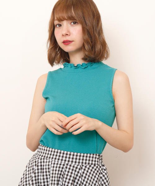 今季らしいプチハイネックを、メロウフリルで可愛くおめかししたトップスです。首元から袖ぐりを大きくカットしたアメスリで、顔や腕まわりのすっきり見せを意識しました。フィット感良く着られるリブ仕上げ、1枚ではもちろんインナーとしてもオススメです。
